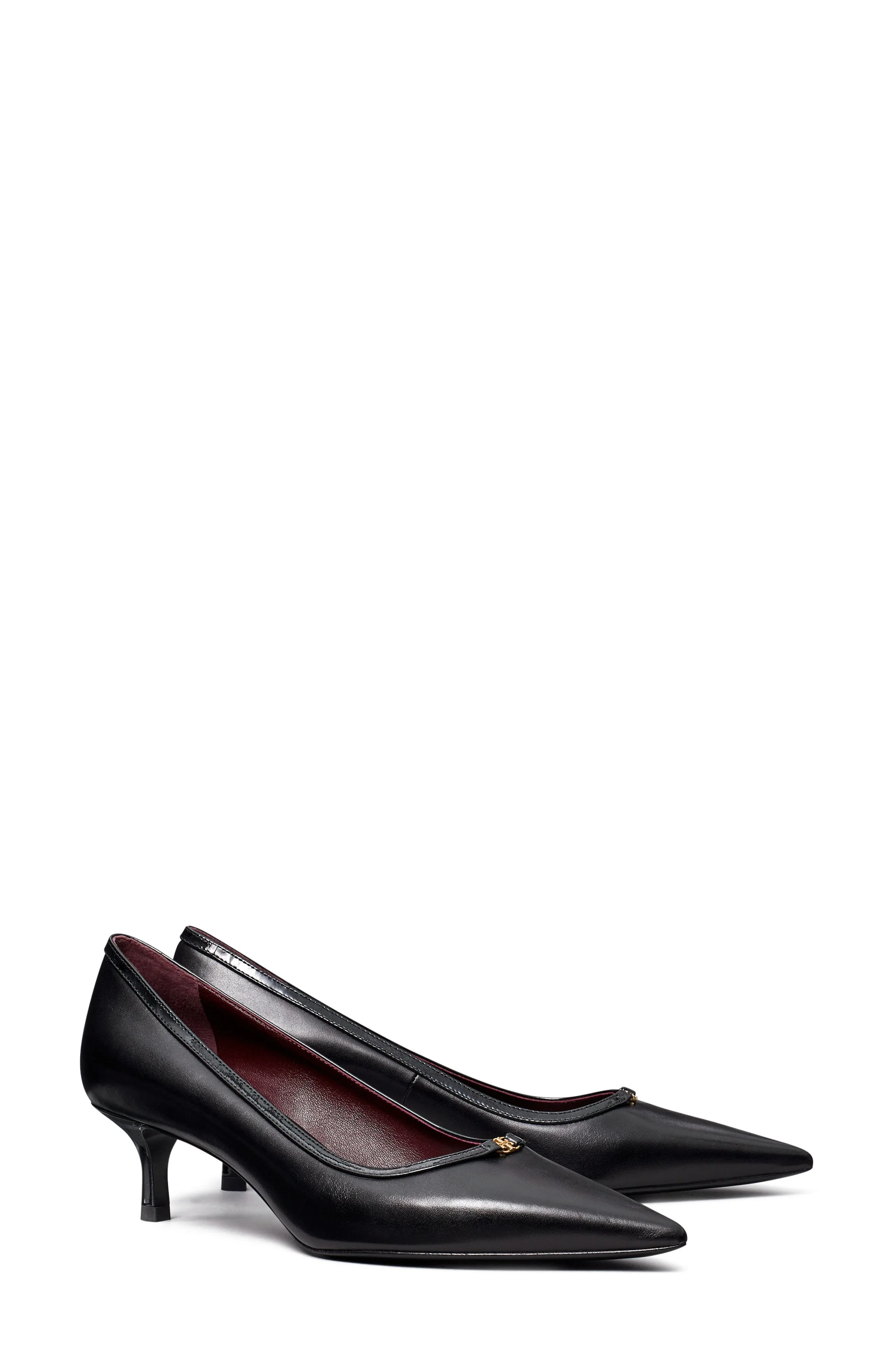 Gleaming logo hardware stands out at the instep of a rich leather pump balanced by a pointy toe and kitten heel. 1 3/4" heel (size 10) Leather upper/leather and synthetic lining/leather sole Imported