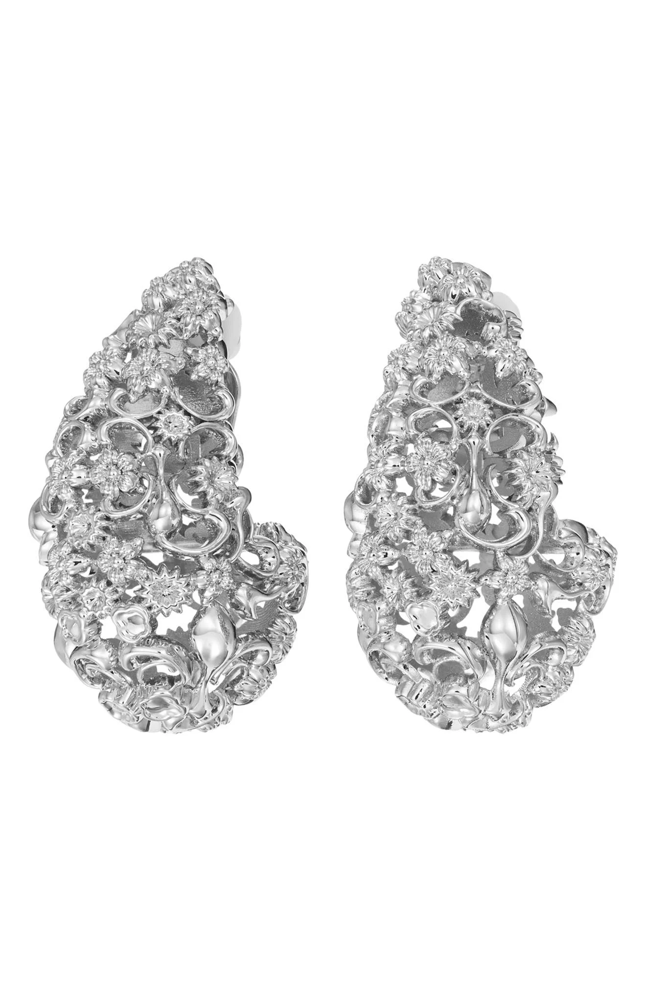 Dainty filigree structures chunky hoop earrings lit up with allover cubic zirconia. 45mm drop; 27mm width Post back Goldtone plate/cubic zirconia Imported