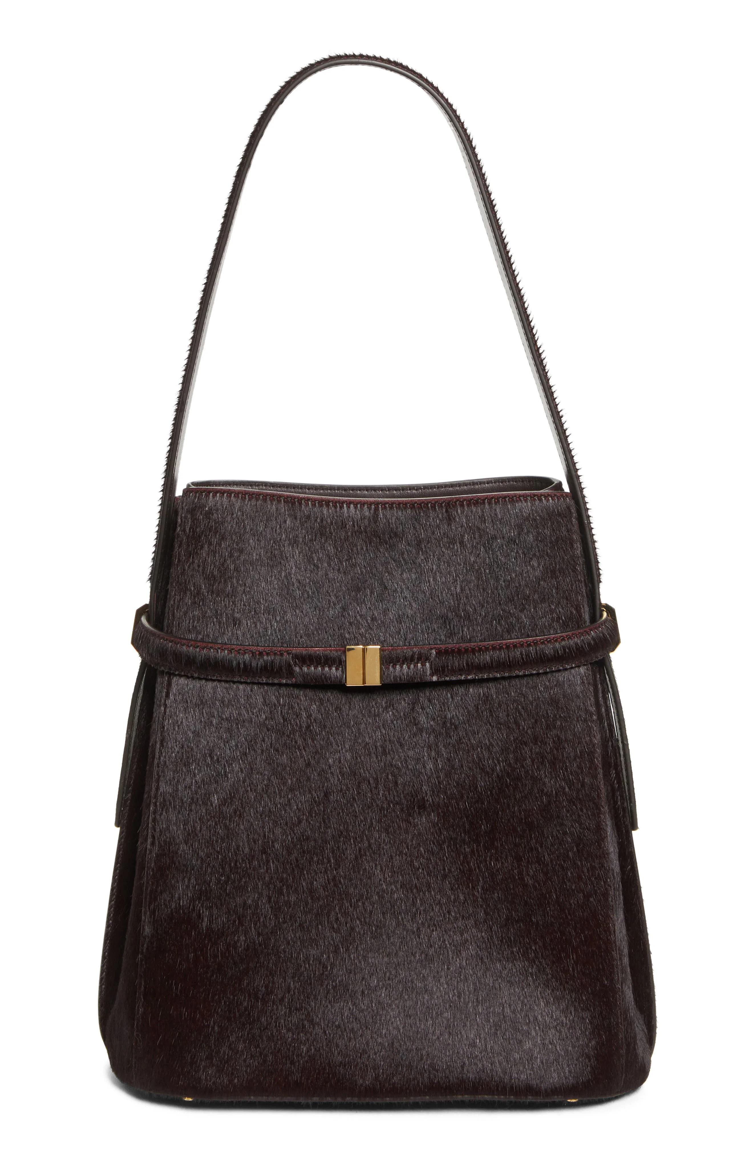 TOTEME Belted Genuine Calf Hair Bucket Bag in Wine at Nordstrom
