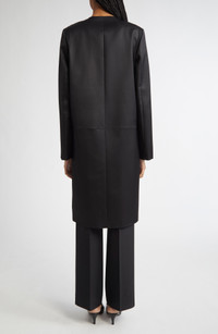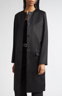 The Scandinavian label synonymous with minimalism and timelessness leans into its roots with this collarless coat tailored from structured stretch chintz with a slight sheen. Hidden-button placket Jewel neck Front flap pockets Lined 55% viscose, 43% organic cotton, 2% elastane Dry clean Imported Designer Clothing