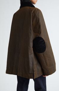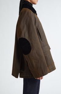 A corduroy collar and elbow patches complete the English country look of this chore jacket cut in a swingy silhouette from waxed organic cotton. 29 1/2" length (size 38EU) Hidden-button placket Spread collar Chest welt pockets; Front flap-patch pockets Side vents Lined, with 100% polyester fill 100% organic cotton Spot clean Made in Romania Designer Clothing