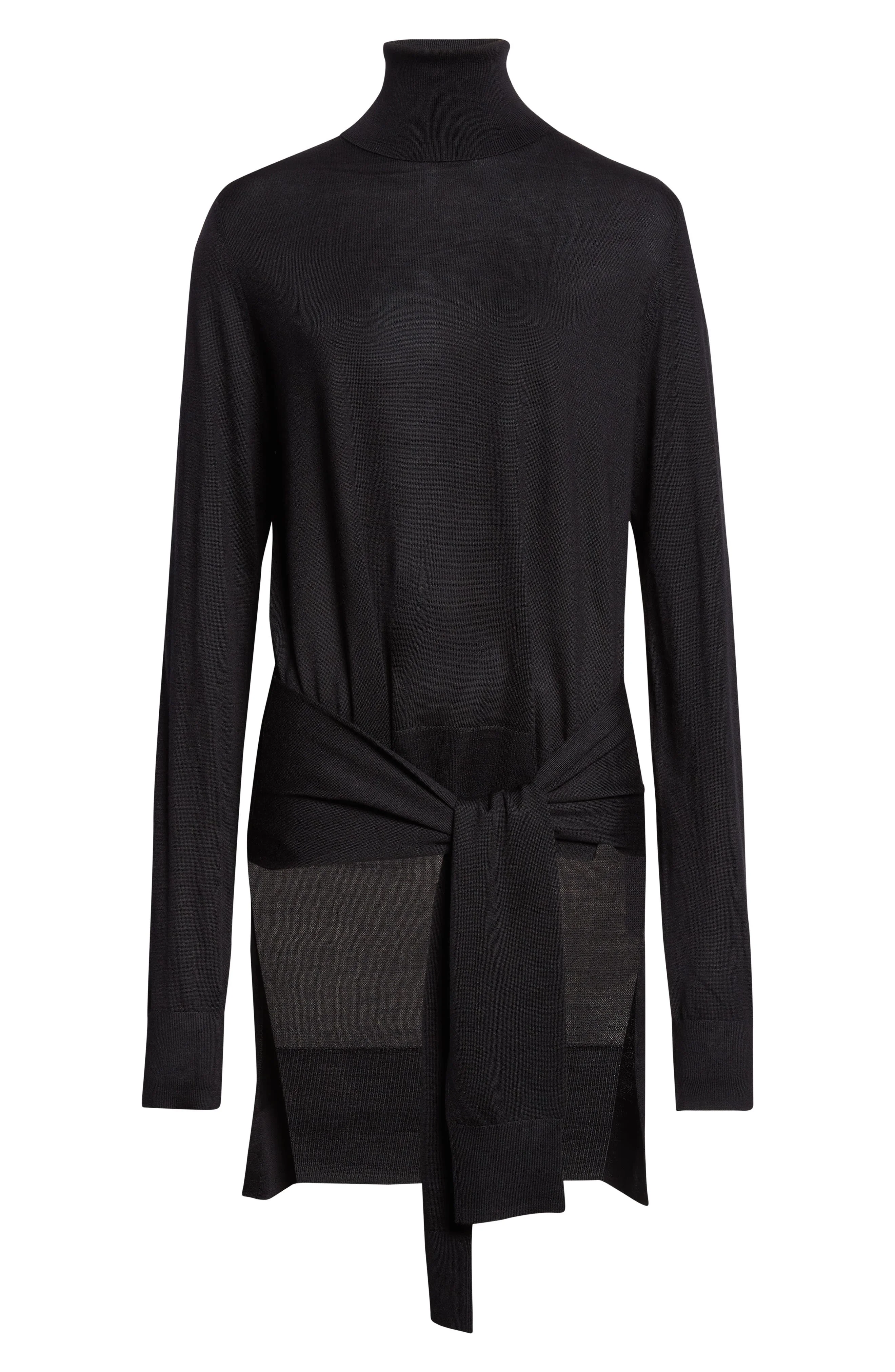 Layering becomes illusion in this directional turtleneck sweater, where additional sleeves sit at the hips to mimic a second sweater relaxed around the waist. The fine-gauge knit traces the body with quiet fluency while the high neck brings a clean, vertical line. Rendered in wool with a hint of silk, it holds shape yet moves with ease and turns a simple sweater into a conversation piece. Turtleneck Long sleeves High-low hem 75% wool, 25% silk Dry clean Imported Designer Clothing