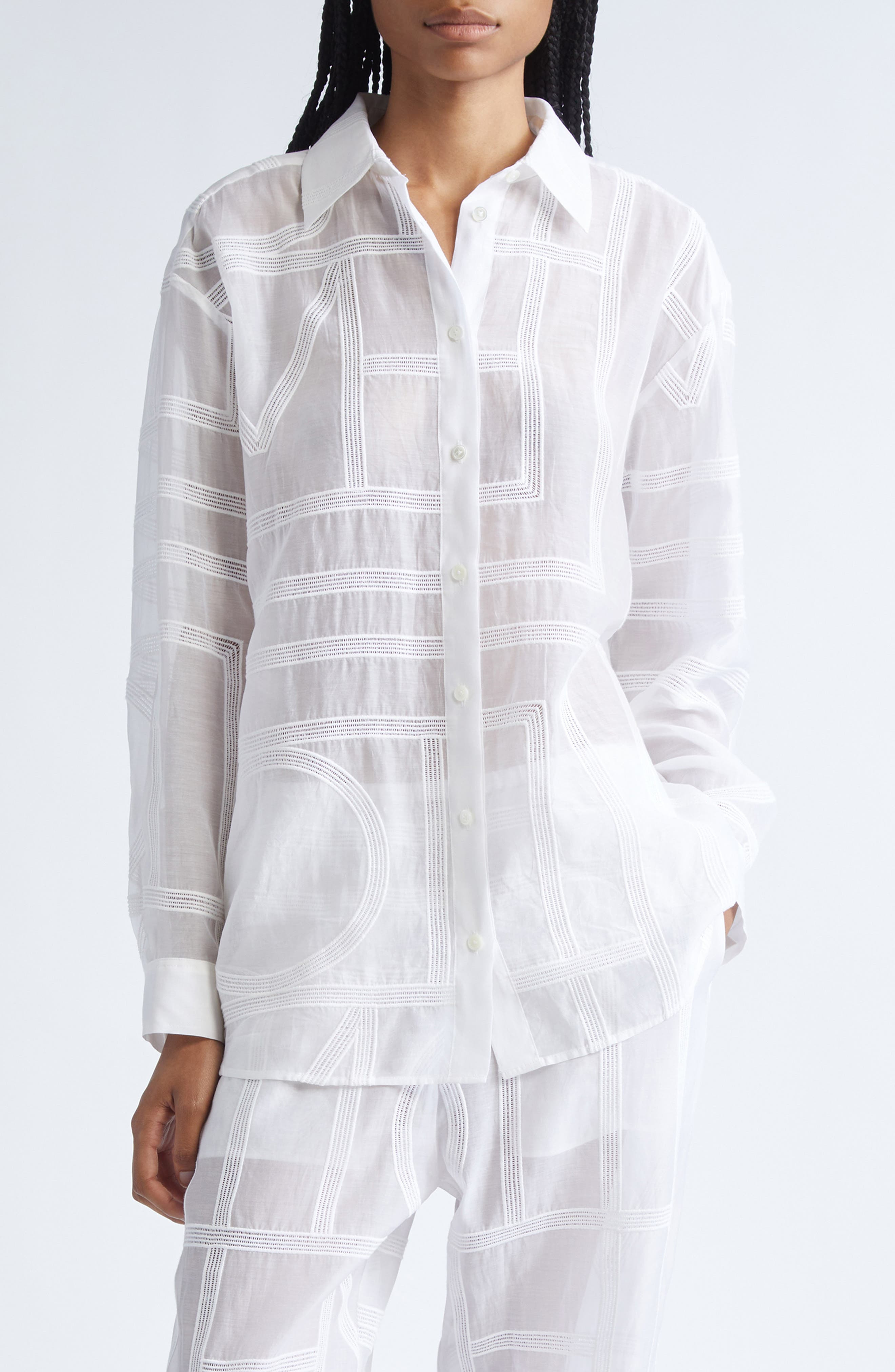 An open-stitched monogram motif on an exploded scale underscores the oversized design of this sheer, silk-softened organic cotton button-up. Front button closure Point collar Long sleeves with two-button cuffs Dropped shoulders Sheer 70% organic cotton, 30% silk Dry clean Imported Designer Clothing