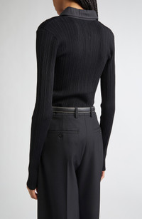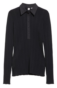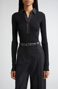 A refined button half placket and contrast accents elevate the sporty aesthetic of this long-sleeve polo, while sculpting ribbed knitwork defines its figure-flaunting silhouette. Button half placket Long sleeves 82% Naia™ acetate, 18% polyamide Naia acetate is a cellulosic fiber consisting of 60% sustainable wood pulp and 40% certified recycled material Dry clean or hand wash, dry flat Imported Designer Clothing