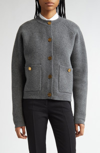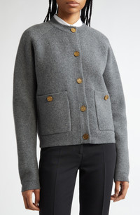 This refined cardigan, highlighted by hammered goldtone buttons on the placket and pockets, is imagined from a wool blend with a hint of cashmere and boasts a spongy, double-sided construction for warmth and softness. Front button closure Crewneck Long sleeves Front patch pockets 88% wool, 8% cashmere, 4% polyamide Hand wash, dry flat Imported Designer Clothing