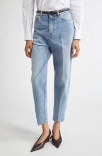 Nonstretch organic cotton lends crisp structure to tapered jeans finished in a versatile blue hue. 13" leg opening; 14" front rise; 17" back rise (size 29/32) Zip fly with button closure Five-pocket style 100% organic cotton Dry clean or machine wash, line dry Made in Italy Women's Designer Clothing