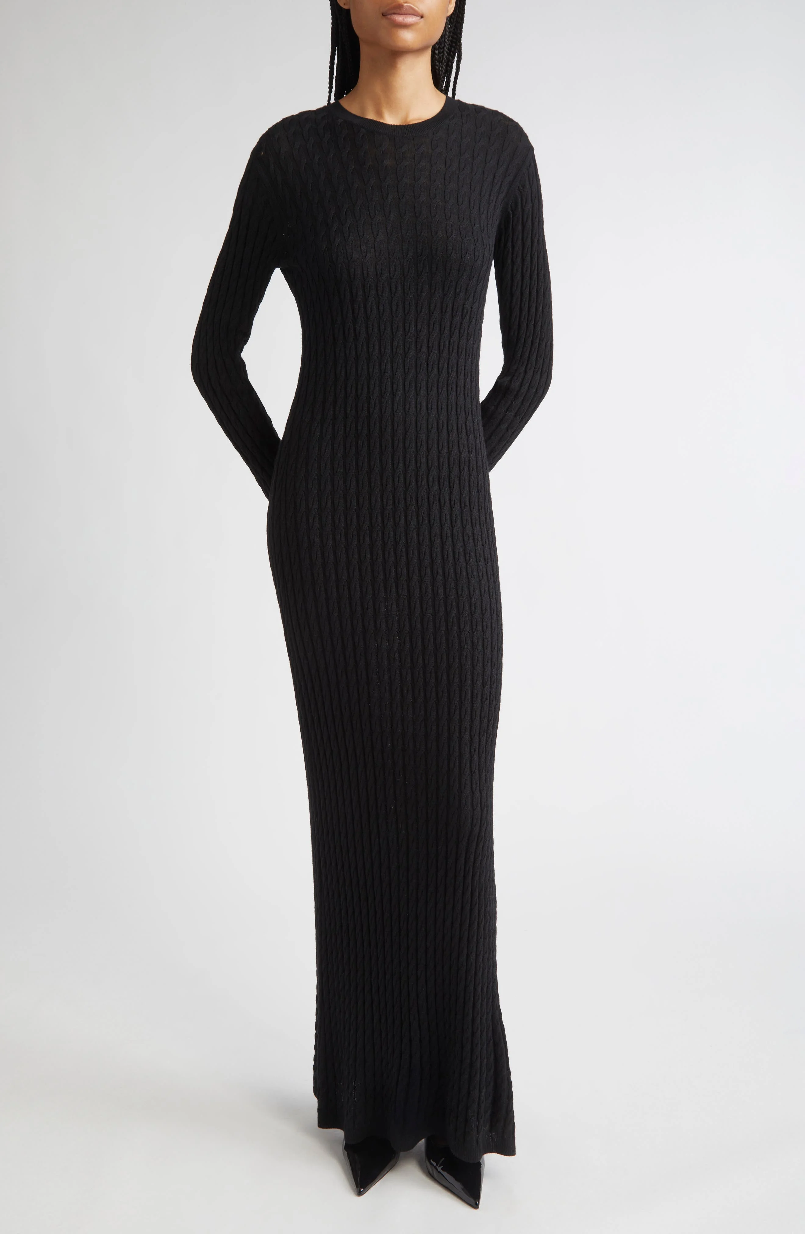 TOTEME Long Sleeve Cable Knit Wool Merino Wool Sweater Dress in Black at Nordstrom