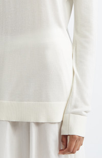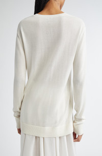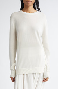 Laidback yet quietly luxe, this knitwear-meets-T-shirt hybrid rewrites the rules of a wardrobe staple. Finely knit from fluid lyocell with a whisper of cashmere, it drapes effortlessly, offering a soft, warm embrace that feels as refined as it looks. Dropped shoulders and a ribbed neckline lend understated structure to its oversized silhouette. Crewneck Long sleeves Dropped shoulders Ribbed cuffs and hem 90% lyocell, 10% cashmere Dry clean Imported Designer Clothing