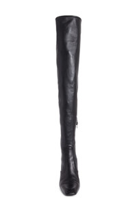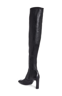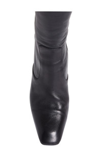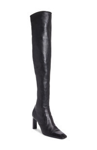 A signature squared-off toe and sculptural set-back heel frame this boot designed in a head-turning over-the-knee silhouette from supple stretch leather. 3 1/4" (83mm) heel Inset side-zip closure Leather upper, lining and sole Made in Italy Designer Shoes
