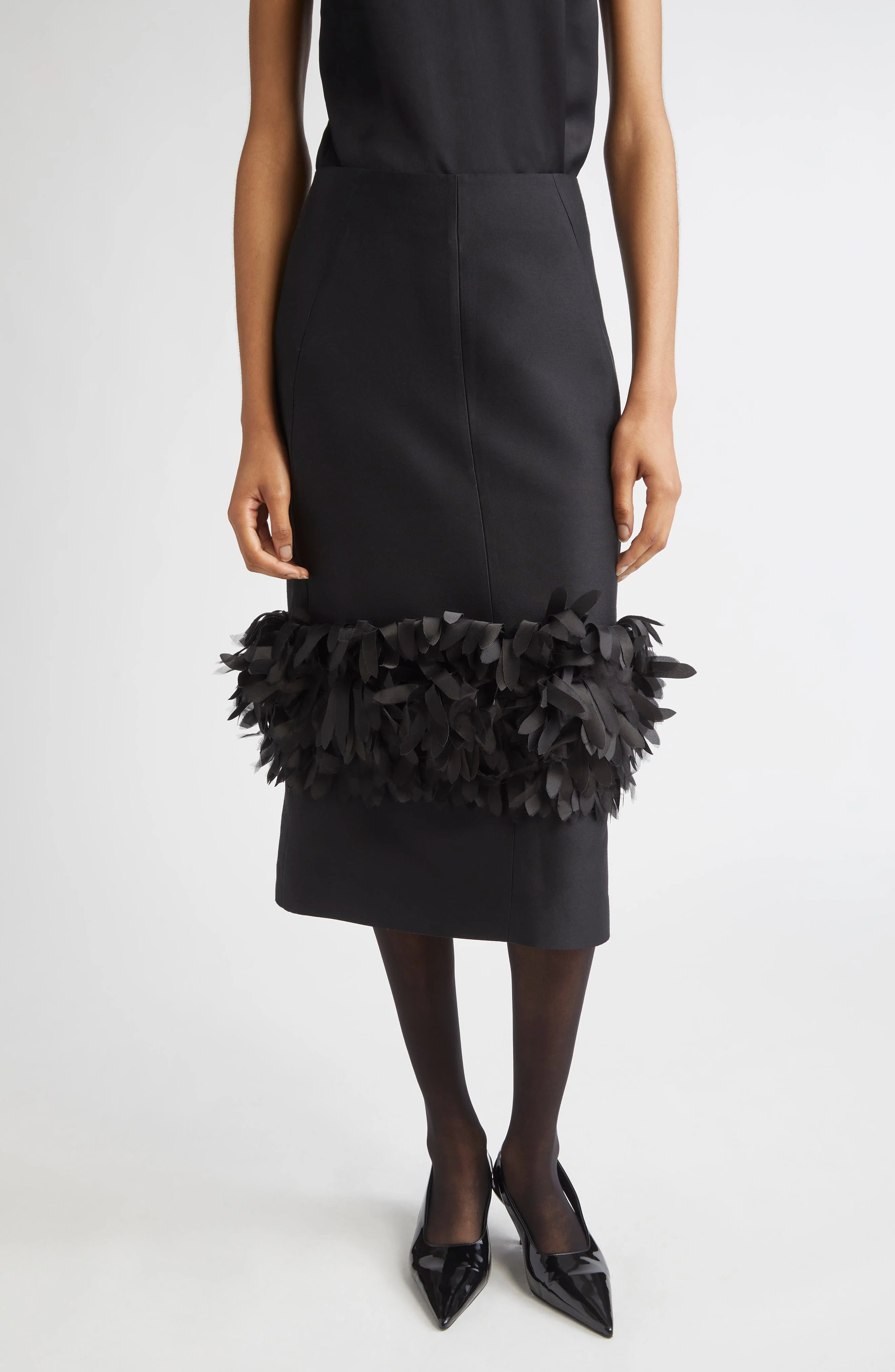 This wool-and-silk midi skirt amplifies movement through an intricately layered band of lightweight petals engineered to sway and echo the soft percussion of feathers. A smooth waistband and calibrated seamwork maintain a clean line so the petal layer becomes the kinetic focus. Hidden back-zip closure Back slit 81% wool, 19% silk Dry clean Imported Designer Clothing