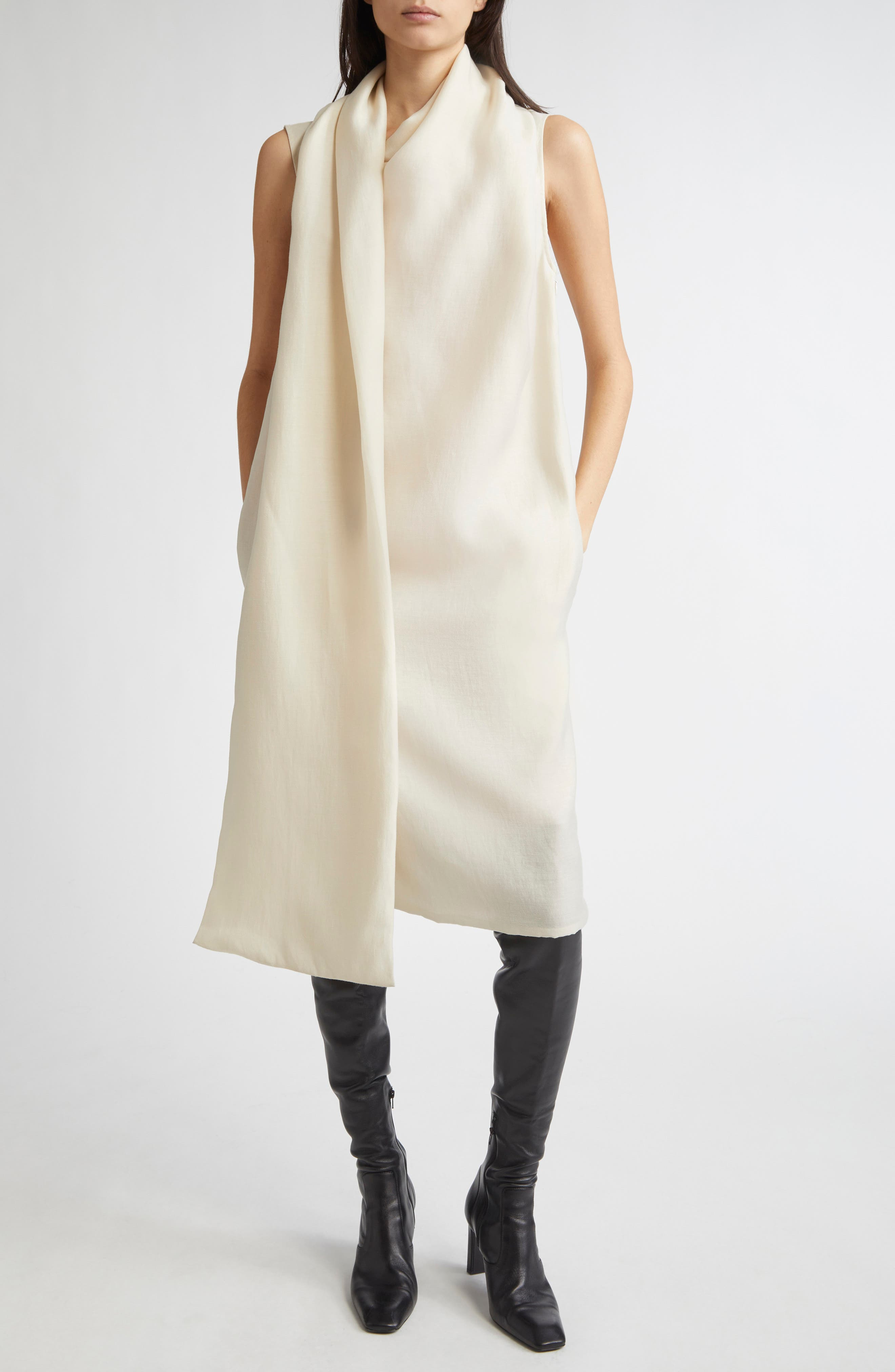 The Scandinavian label synonymous with minimalism and timelessness leans into sultry drama with this fluid dress featuring a scarf-like panel that drapes down the side. Hidden side-zip closure Scarf neck Sleeveless Side-seam pockets Lined 65% lyocell, 25% polyester, 10% linen Dry clean Imported Designer Clothing