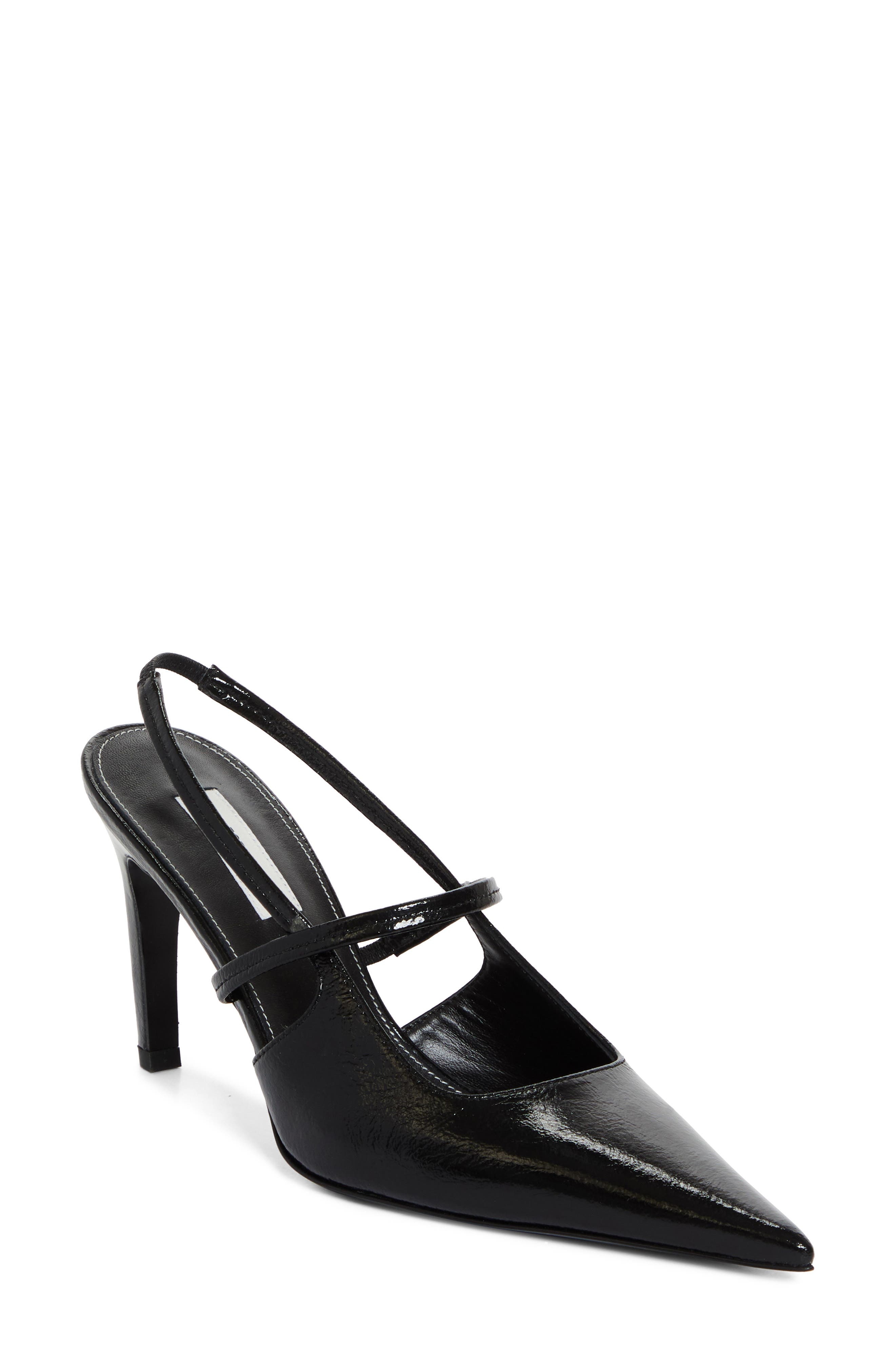 Intersecting straps add to the elegant geometry of this pointy-toe pump made in Italy from crinkled naplak leather and updated with a daring stiletto. 3 1/4" (85mm) heel Elasticized slingback strap Leather upper, lining and sole Made in Italy Designer Shoes