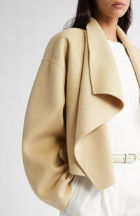 Draped lapels enhance the sculptural design of this wool jacket with a hand-stitched, double-face construction that makes the interior as soft and warm as the exterior without the need for sewn-in lining. Open front Draped lapels On-seam pockets 100% wool Dry clean Imported Designer Clothing