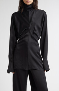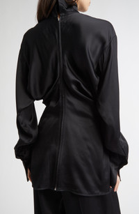 From collar to hem, the construction of this sleek top explores tension and ease, setting glossy satin against a waist that relaxes into a measured slouch for modern contour. A close turtleneck anchors the look while flared cuffs with a single button enhance the fluid proportions and the centered seam projects clear tailoring intent. Back zip closure Turtleneck Long sleeves with flared one-button cuffs 100% viscose Hand wash, line dry Imported Designer Clothing