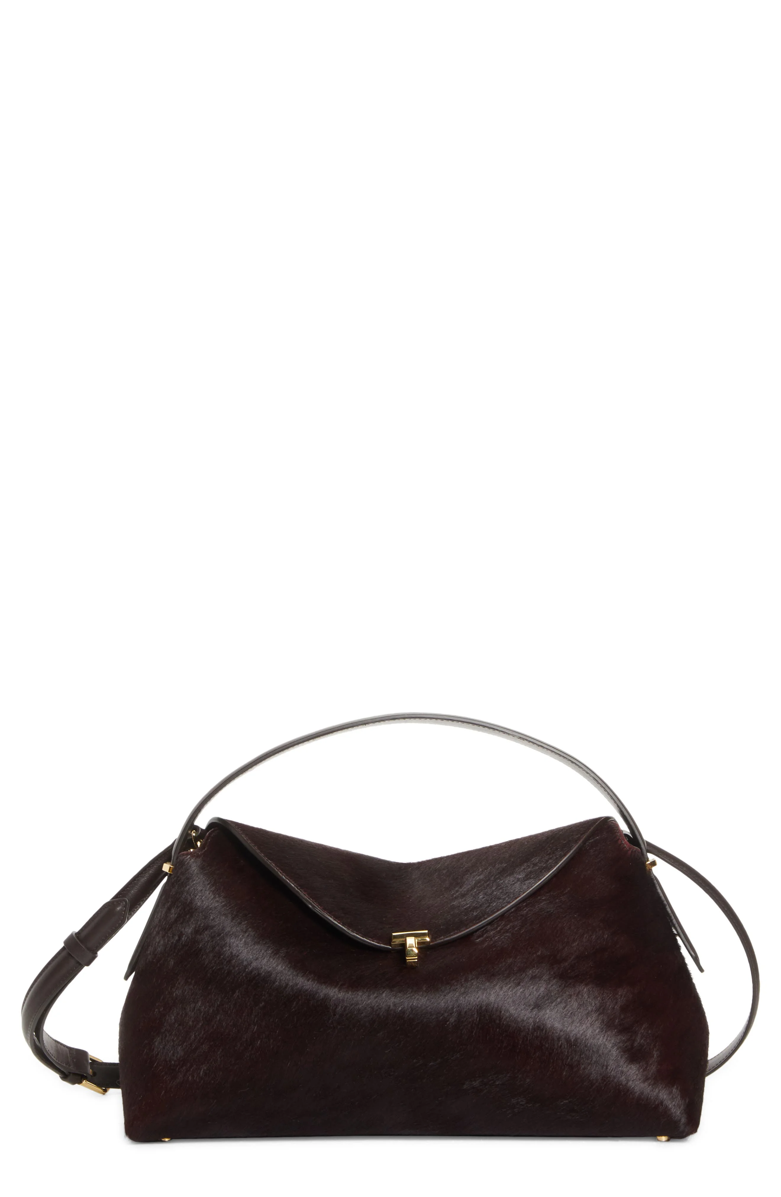 A T-shaped clasp nods to the 'T' in Toteme on this softly structured bag crafted of silky genuine calf hair and trimmed with smooth leather. A removable shoulder strap offers another carrying option. Turnlock closure Top carry handle; removable, adjustable shoulder strap Two interior wall pockets Protective metal feet Genuine calf hair (Italy) Made in Italy Designer Handbags