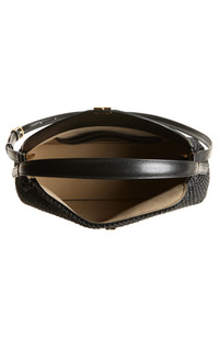 Woven sheepskin leather stands out against the smooth, curved flap of an Italian-crafted bag quietly branded with a T-shaped clasp. Turnlock closure Top carry handle; removable, adjustable shoulder strap Two interior card slots Protective metal feet Microsuede lining Leather Made in Italy Designer Handbags