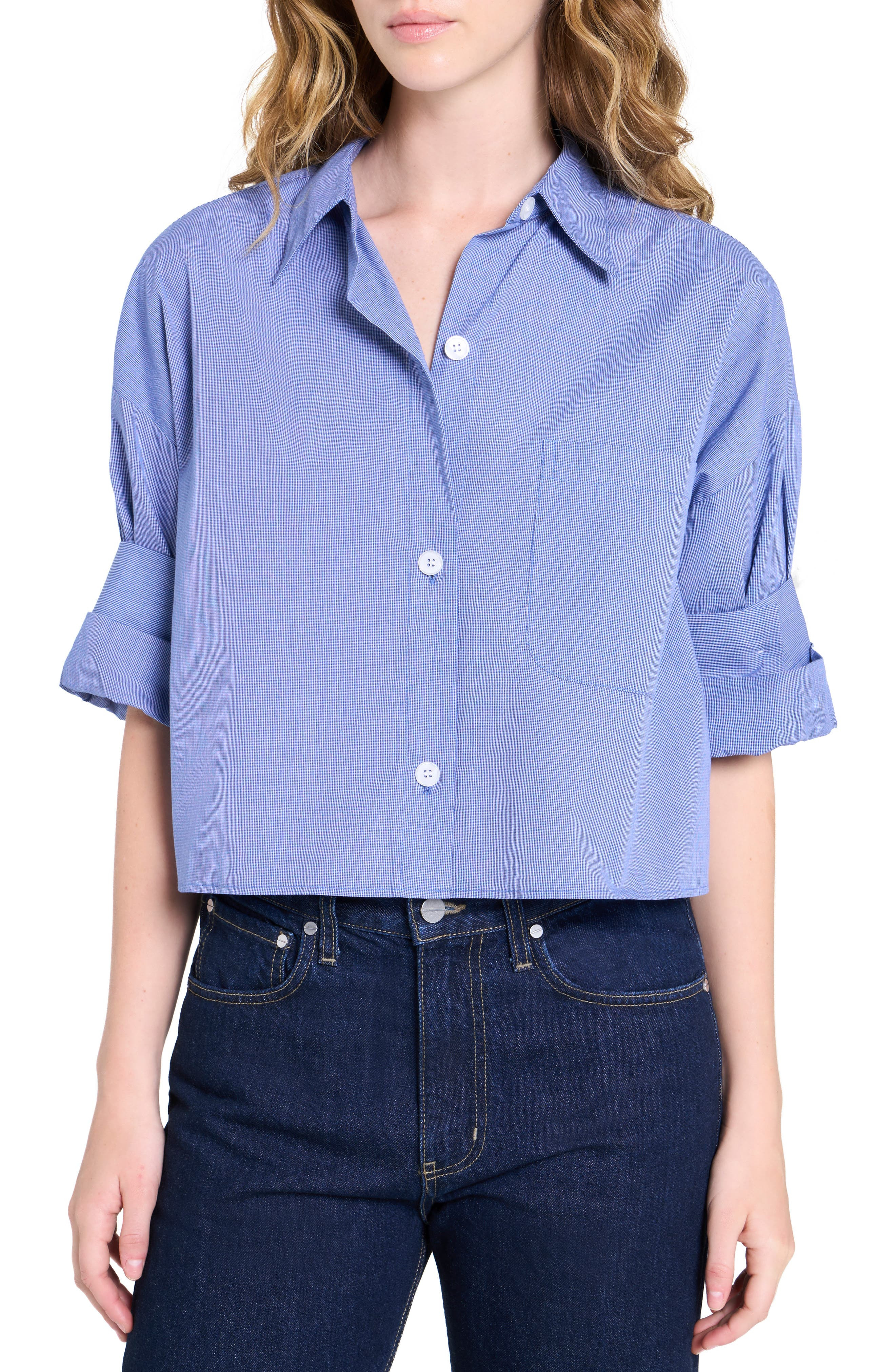 TWP Next Ex Crop Cotton Button-Up Shirt in White/Navy at Nordstrom