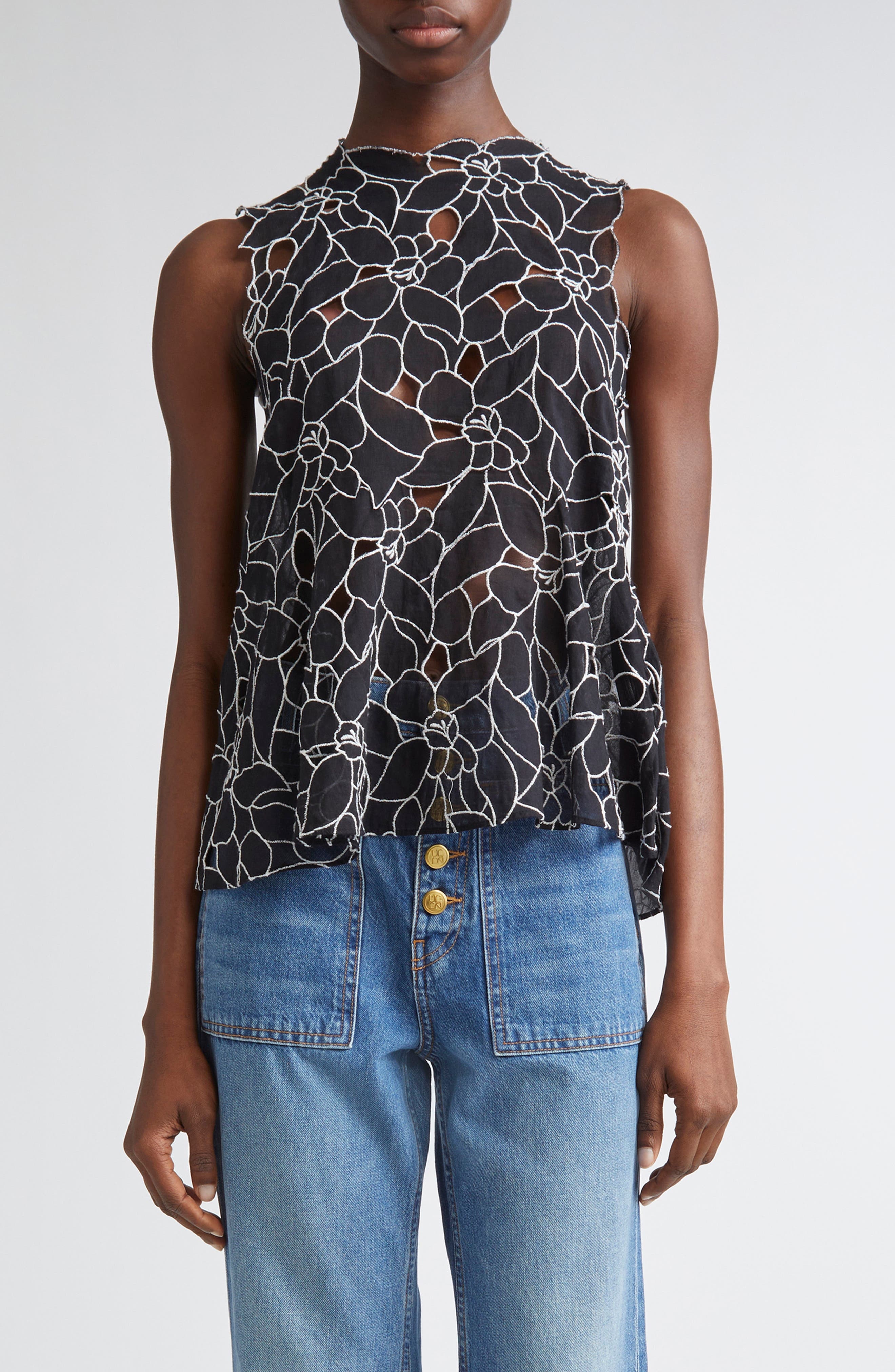 Swirling floral stitching and airy cutouts enhance the enchantment of this sleeveless top finished with a flouncy high/low hem. Back keyhole with button-and-loop closure Jewel neck Sleeveless 100% cotton Dry clean Imported