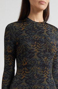 Subtle animal stripes make this long-sleeve knit dress an enticing option for a wide range of occasions. Slips on over head Crewneck Long sleeves Unlined 91% rayon, 9% elastane Machine wash, dry flat Imported