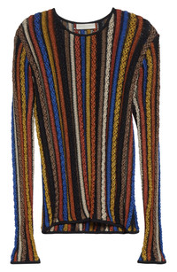 Airy open stitching brings breathable charm to this colorfully striped top made in a close fit. Jewel neck Long sleeves 80% nylon, 20% viscose Dry clean Imported