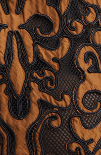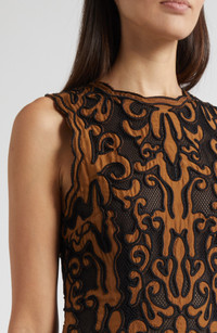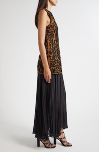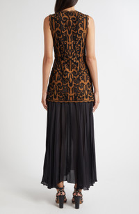 Swirling appliques embolden this sleeveless maxi punctuated with a flowy pleated skirt in luxurious silk. Back keyhole with button-and-loop closure Jewel neck Sleeveless 100% silk with 100% polyester contrast Dry clean Imported