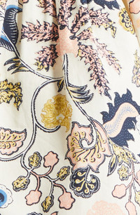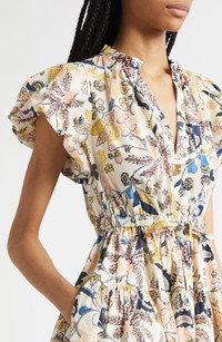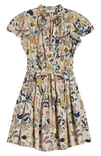 An artistic floral pattern blossoms on a woven cotton minidress fashioned with puff sleeves and a matching tie belt. Split neck Short sleeves Elastic waist Side-seam pockets Removable tie belt Unlined 100% cotton Hand wash, line dry Imported