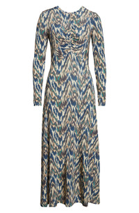 Center ruching adds rippling dimension to the fitted bodice of this ikat-print jersey dress cut with a flowy skirt in an ankle-skimming length. 52" length (size Medium) Slips on over head Crewneck Long sleeves 91% rayon, 9% elastane Hand wash, line dry Imported