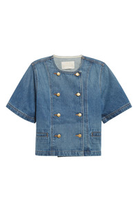 Gilded double-breasted buttons bring high-shine appeal to this boxy denim shirt. Double-breasted button closure Jewel neck Short sleeves Front welt pockets 100% cotton Machine wash, line dry Imported