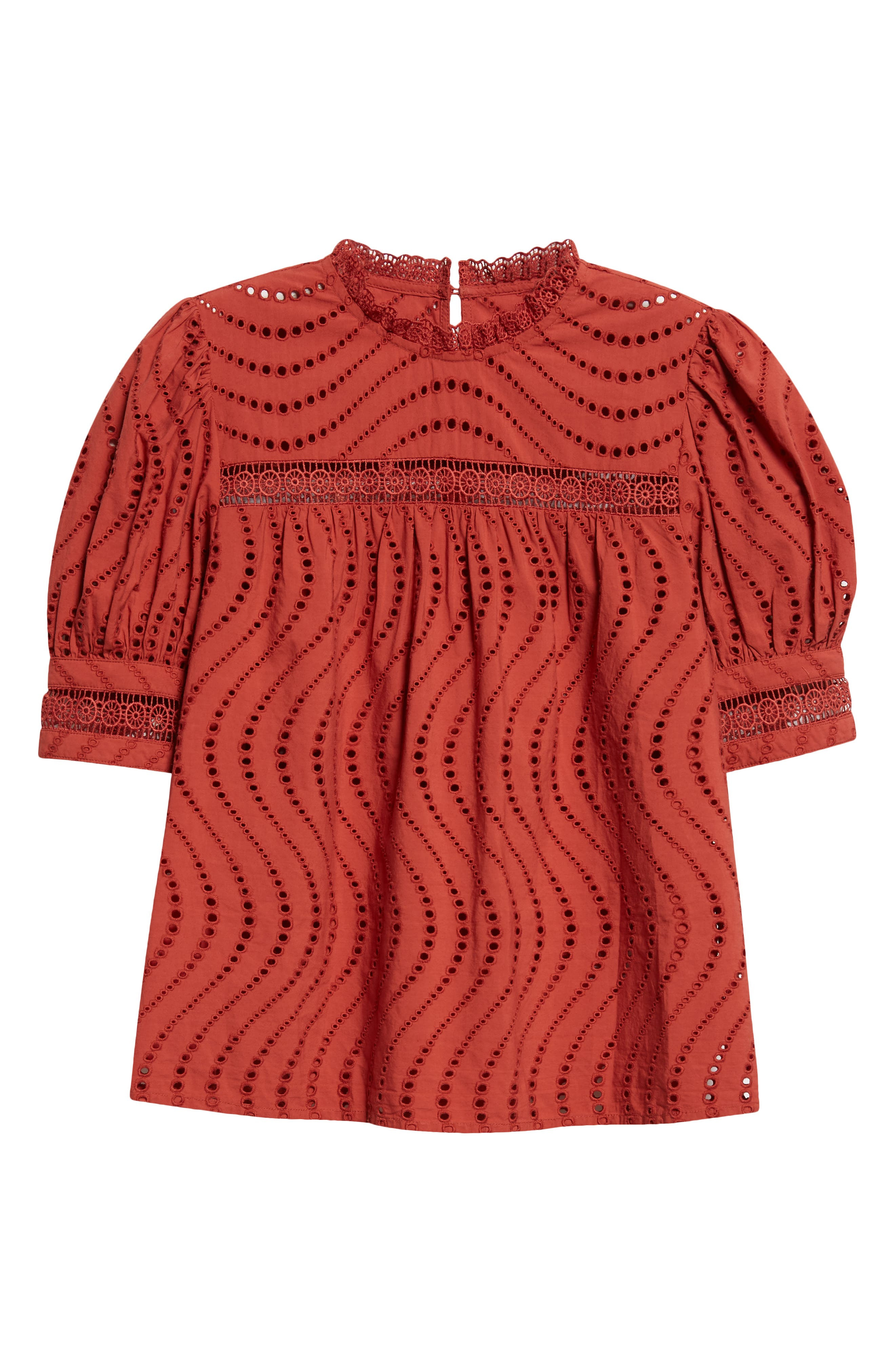 Delightful puff sleeves sweeten the silhouette of this breezy cotton top covered in swirling eyelets and accented with lovely lace. Back keyhole with button-and-loop closure Ruffle collar Short sleeves 100% cotton Dry clean Imported