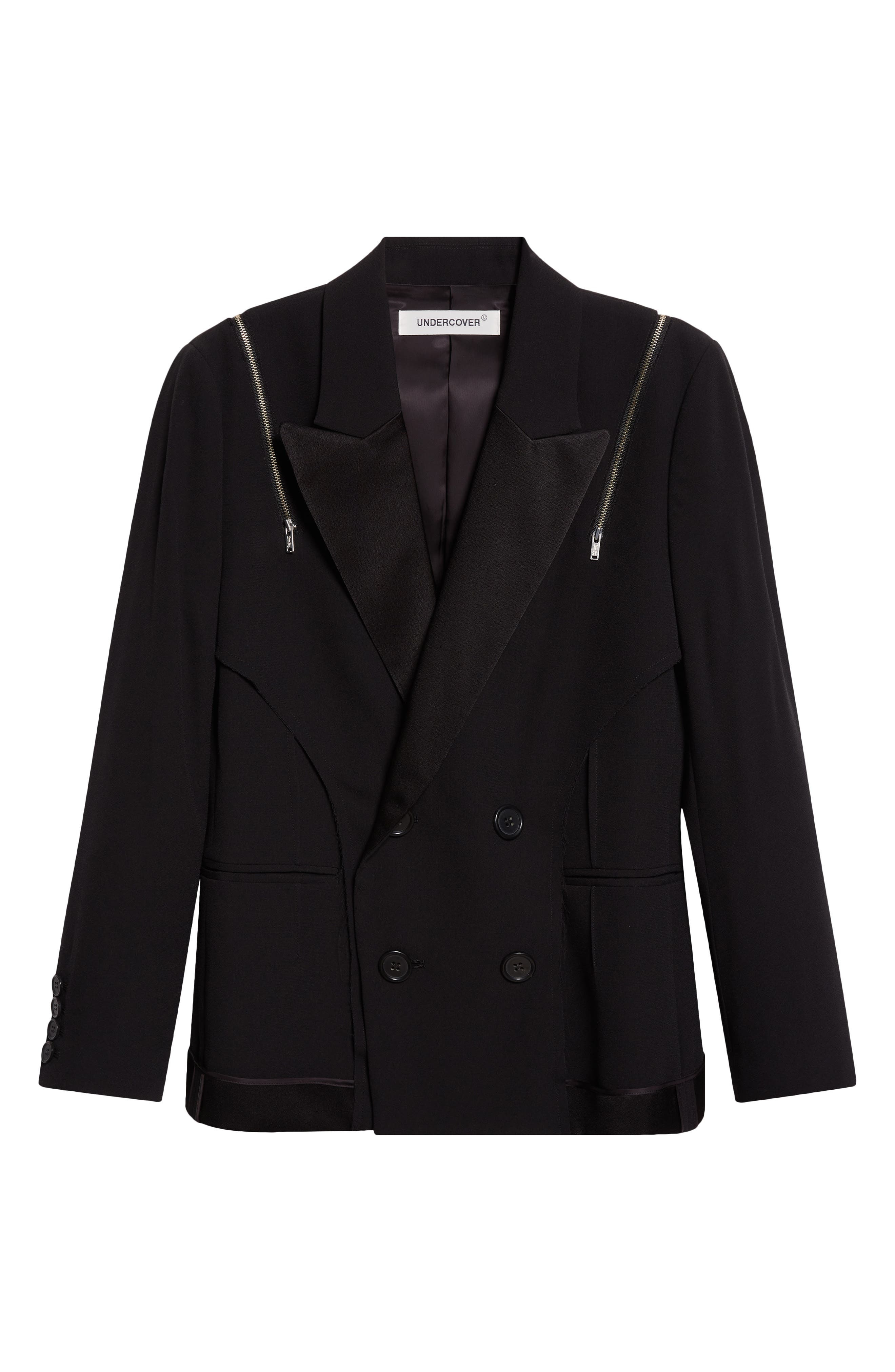 Jun Takahashi examines the concept of right-sidedness on this peaked-lapel blazer featuring an inside-out design with functional zips for an edgy element. Double-breasted button closure Peaked lapels Four-button cuffs Front welt pockets Cupro lining 67% triacetate, 17% cupro, 16% polyester Dry clean Imported Designer Clothing Asian & Pacific Islander Owned/Founded