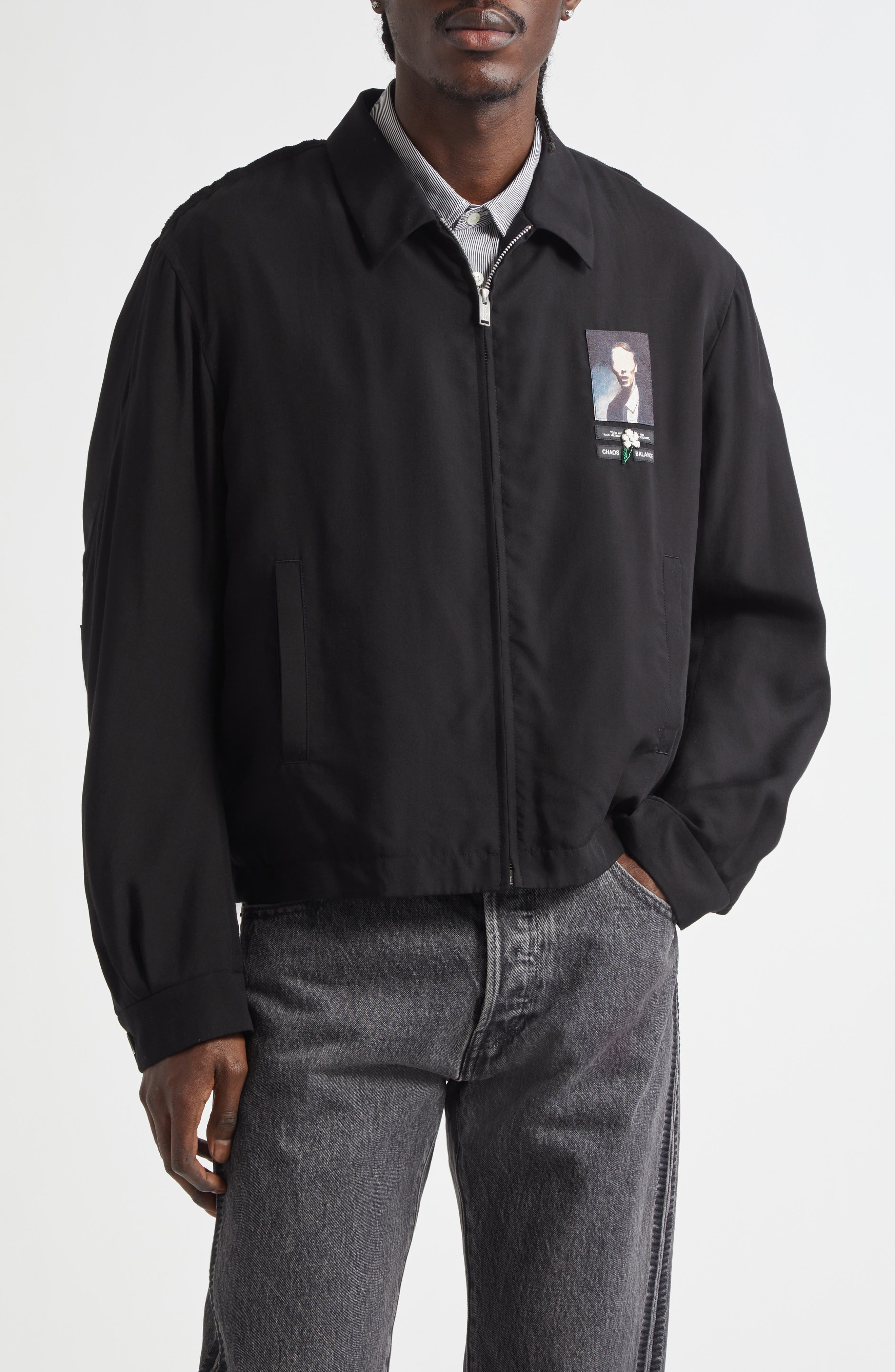 A punk-plaid cotton lining hints at the core aesthetic and epigraph marking the chest of this jacket from designer Jun Takahashi's spring '25 collection. Front zip closure Spread collar Button-tab cuffs Cotton lining 100% rayon Dry clean Made in Japan Designer Clothing Asian & Pacific Islander Owned/Founded