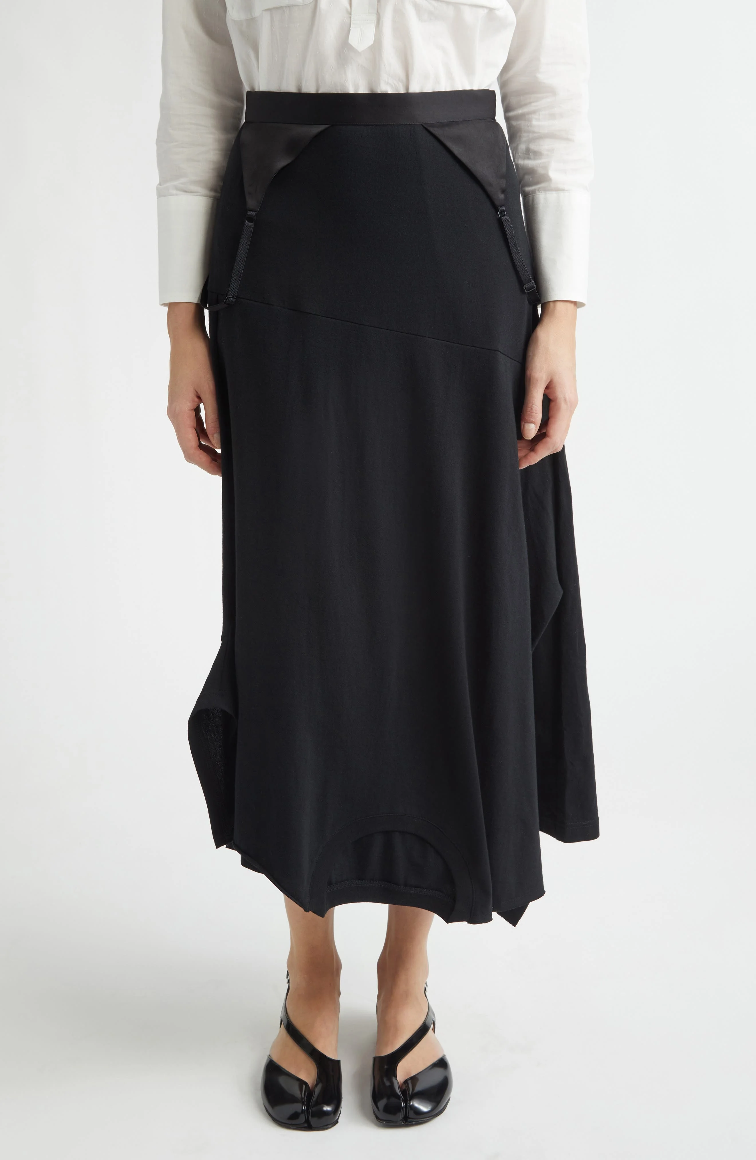 A bralette overlay with dangling straps adds a playful flourish to this midi skirt done in a bias-cut asymmetric silhouette. Hidden side-zip closure 100% cotton with 100% polyester contrast Dry clean or hand wash, line dry Made in Japan Designer Clothing Asian & Pacific Islander Owned/Founded
