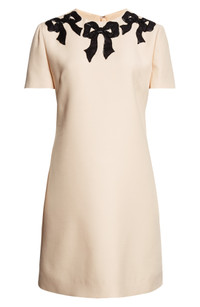Bows are big for Alessandro Michele's fall '25 outing but they're scaled down here in a bead-sparkled satin trio decorating an elegant minidress fashioned from the maison's woolly, silk-enriched Crepe Couture fabric. Hidden back-zip closure Jewel neck Short sleeves 65% virgin wool, 35% silk Dry clean Made in Italy Designer Clothing