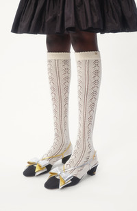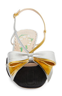 A double bow in two-tone metallic leather brings silver-and-gold shine to this slingback pump that's made in Italy from grosgrain and given walkable height from a block kitten heel. 1 3/4" (45mm) heel Adjustable slingback strap with buckle closure Textile and leather upper/leather lining and sole Made in Italy Designer Shoes