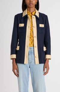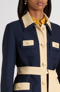 An en vogue '70s look, this belted jacket tailored from lighter-weight viscose canvas features a two-tone design and V-gilded buttons gracing the placket and pockets. Front button closure Point collar Button cuffs Chest button-patch pockets; front button-patch pockets Removable tie belt Back vent Cotton lining 100% viscose Dry clean Made in Italy Designer Clothing