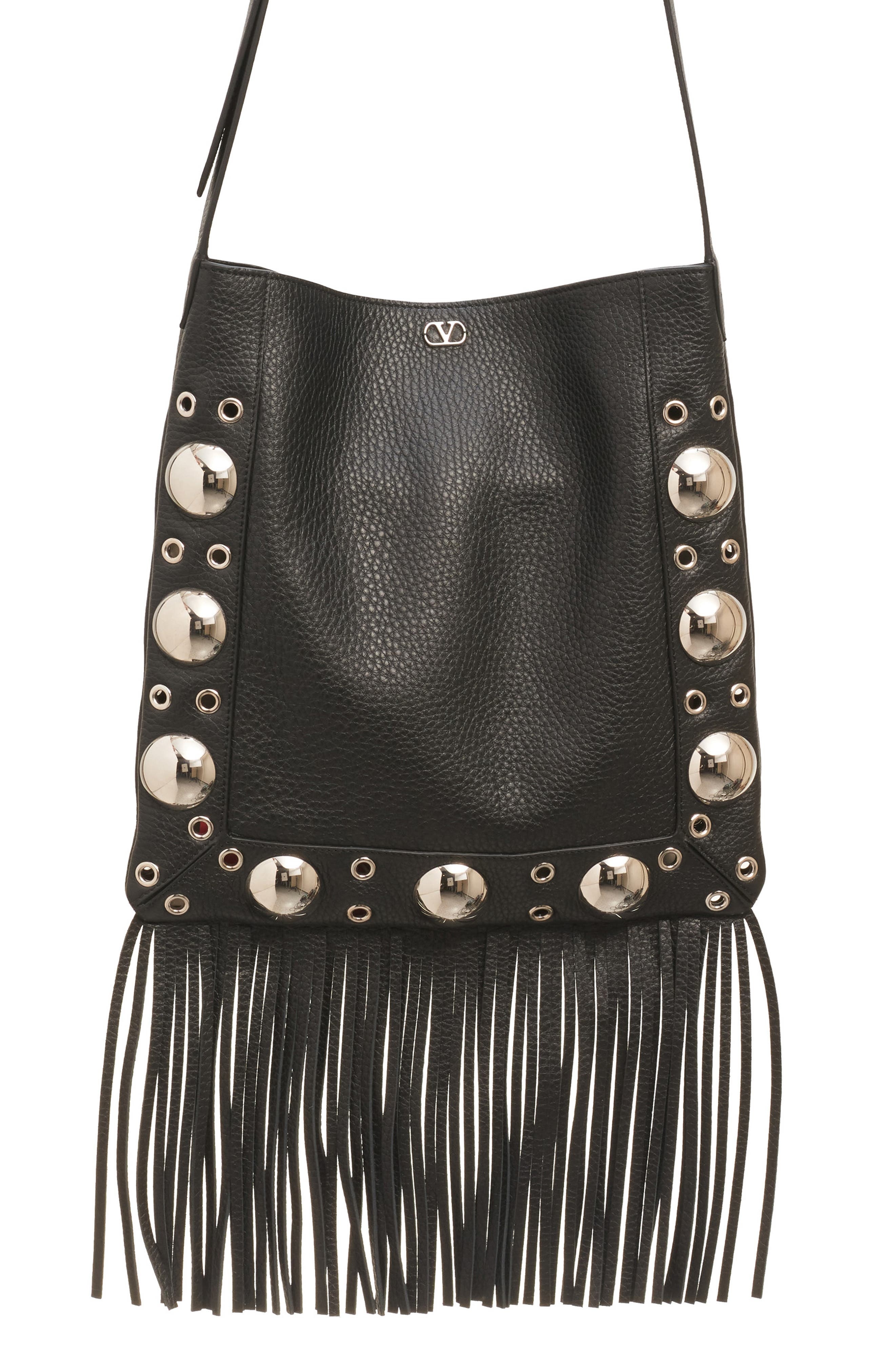 A signature VLOGO and boldly oversized studs and grommets amp up the hardware shine of this richly pebbled Italian-calfskin crossbody cascading with bohemian fringe. Open top Adjustable crossbody strap Leather Made in Italy Designer Handbags