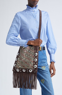 VLOGO hardware, studs and grommets lend contrasting shine to a richly embroidered crossbody bag made of suede and trimmed in cascades of bohemian fringe. 12"W x 12"H x 1 1/4"D 20" shoulder strap drop Open top Adjustable shoulder strap Leather Made in Italy Designer Handbags