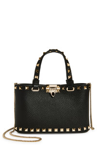 Shiny pyramid studs highlight the softly structured shape of a pebbled-calfskin shoulder bag that expertly balances elegance with rock-'n'-roll edge. Top handles and a gleaming chain strap offer carrying options for the prestigious look. 7"W x 5"H x 2"D 3 1/2" handle drop; 23 1/2" shoulder drop Flip-lock closure Top carry handles; removable chain crossbody strap Two interior card slots Leather Made in Italy Designer Handbags