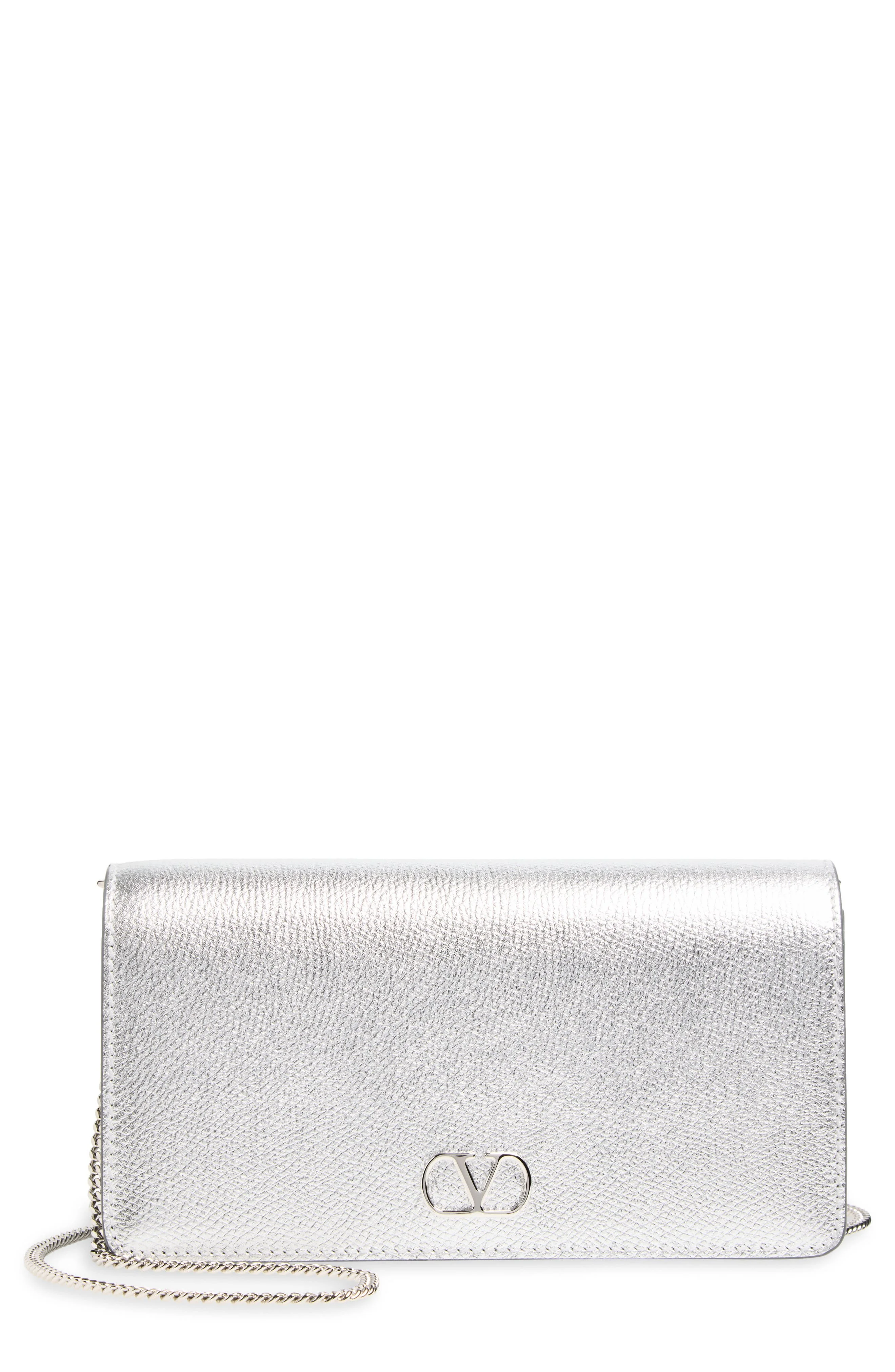 The label's signature VLOGO gleams at the flap of this compact metallic-calfskin bag made versatile with a removable chain that allows for shoulder wear or clutch carry. Flap closure Removable chain strap Interior zip pocket; three card slots Leather Made in Italy Designer Handbags