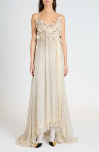 Peppered with polka dots, this silk georgette gown is cut in a flowy floor-pooling silhouette frothed with ruffles and delicate lace. The look is part of Alessandro Michele's 'Pavillon des Folies' collection that's an ode to extravagant classicism. Side zip closure V-neck Spaghetti straps Front slit 100% silk Dry clean Made in Italy Designer Clothing