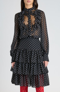A ruffle-framed sheer tulle bib trimmed with lace lends sultry appeal to this button-up shirt cut from silk georgette enlivened with polka dots. 25 1/2" length (size 2US/38IT) Front button closure Stand collar Long sleeves with button cuffs Semisheer 100% silk Dry clean Made in Italy Designer Clothing