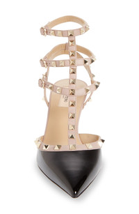 Signature pyramid studs glint on the caged triple straps of an edgy patent-leather pump with a slim heel and pointy toe. 2 1/2" (65mm) heel (size 38.5) 4" strap height Adjustable ankle straps with buckle closure Leather upper, lining and sole Made in Italy Designer Shoes