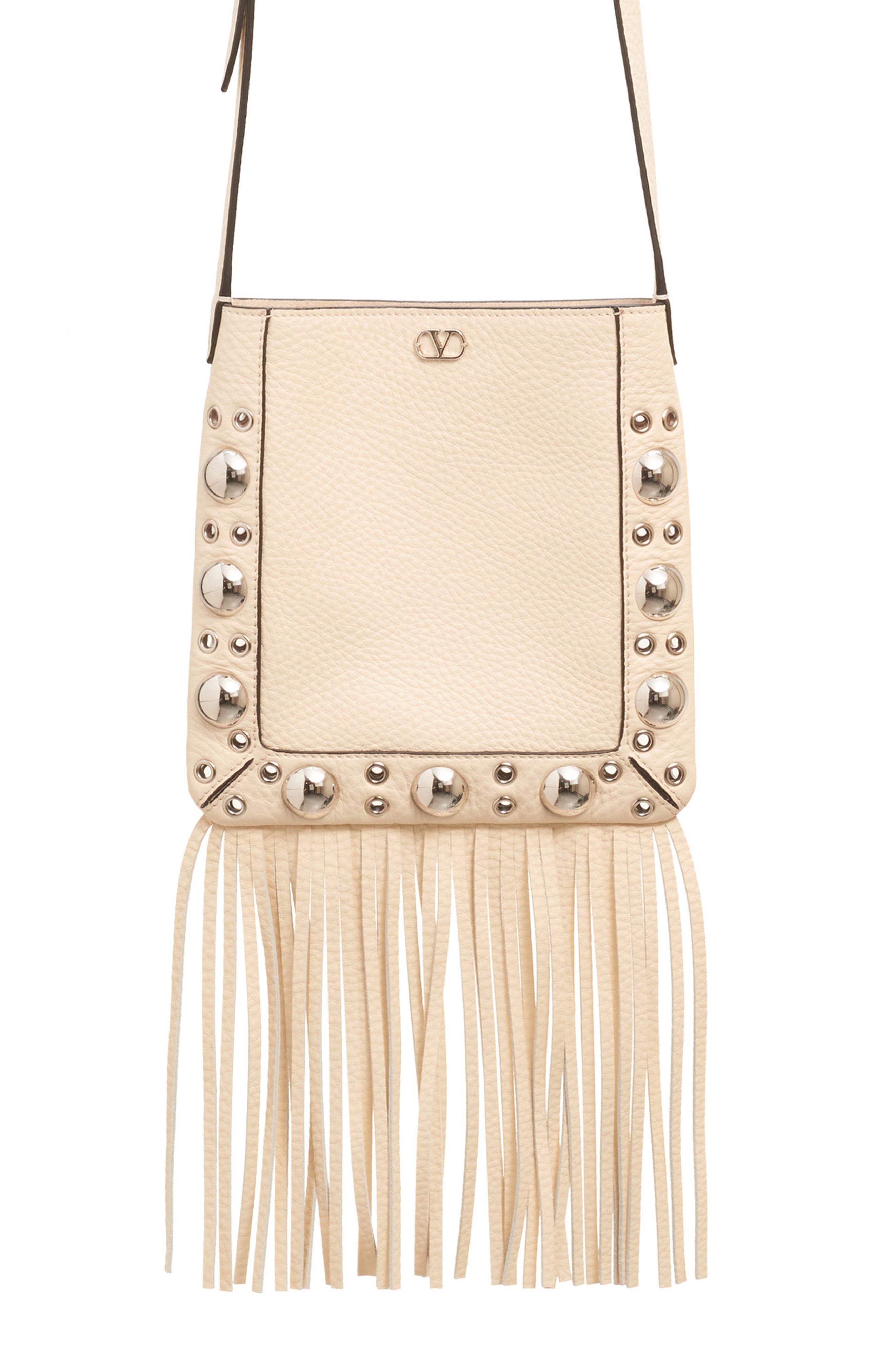 A signature VLOGO and boldly oversized studs and grommets amp up the hardware shine of this richly pebbled Italian-calfskin crossbody cascading with bohemian fringe. Open top Adjustable crossbody strap Leather Made in Italy Designer Handbags