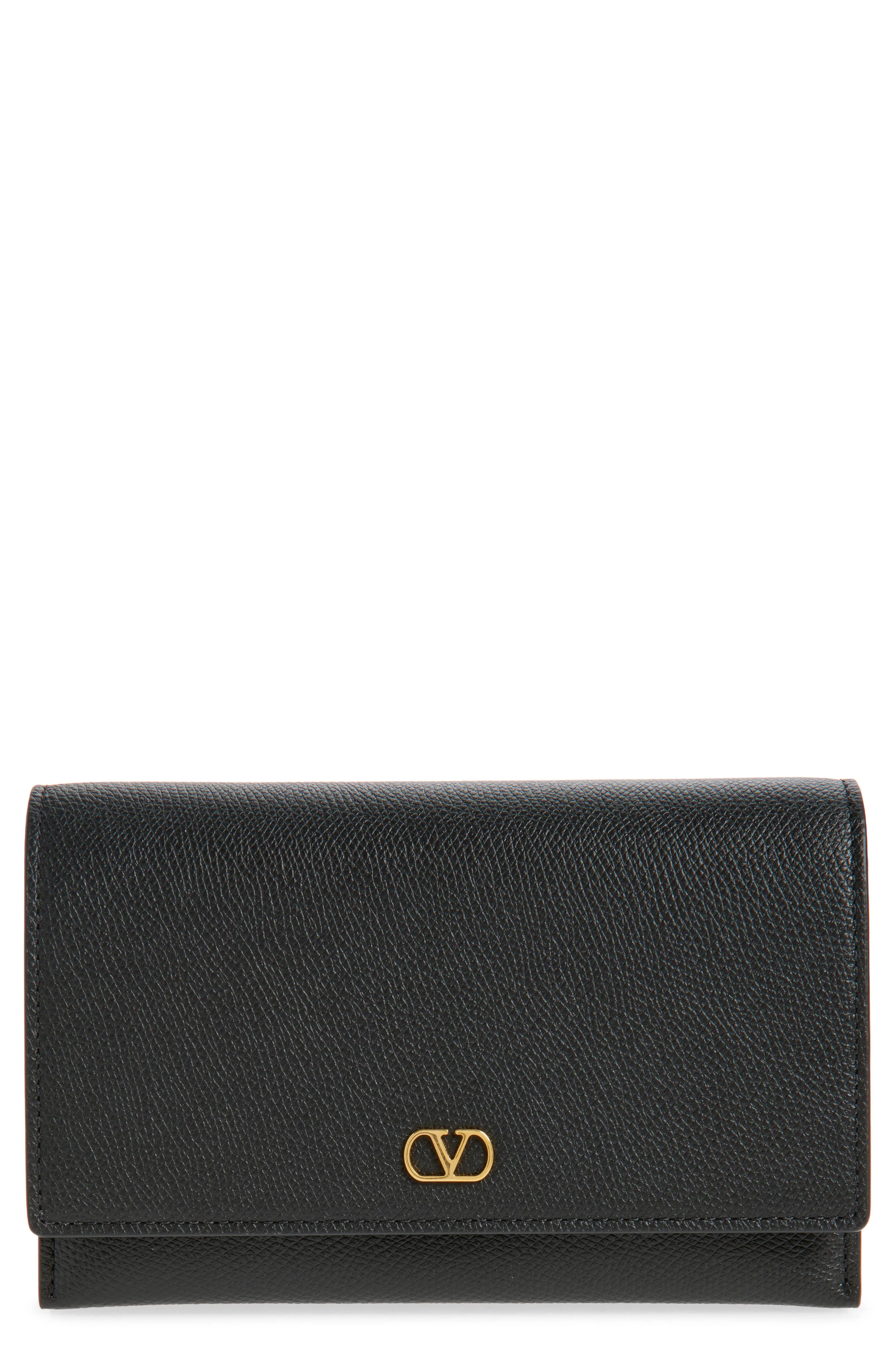 A golden '70s-revival VLOGO gleams on the flap of this thoughtfully designed wallet made of grainy calfskin and paired with a removable chain strap for hands-free carry. Magnetic-snap flap closure Removable chain strap Dual interior compartments with center slip-pocket divider; two card slots Leather Made in Italy Designer Handbags