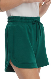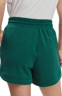 Comfort and contemporary style combine in these dolphin-hem sweat shorts made from the brand's lightweight DoubleSoft® fabric. 4" inseam; 26" leg opening; 12 1/2" front rise; 17" back rise (size Medium) Elastic/drawstring waist Side-seam pockets Dolphin hems 72% viscose, 23% polyester, 5% elastane Machine wash, dry flat Imported