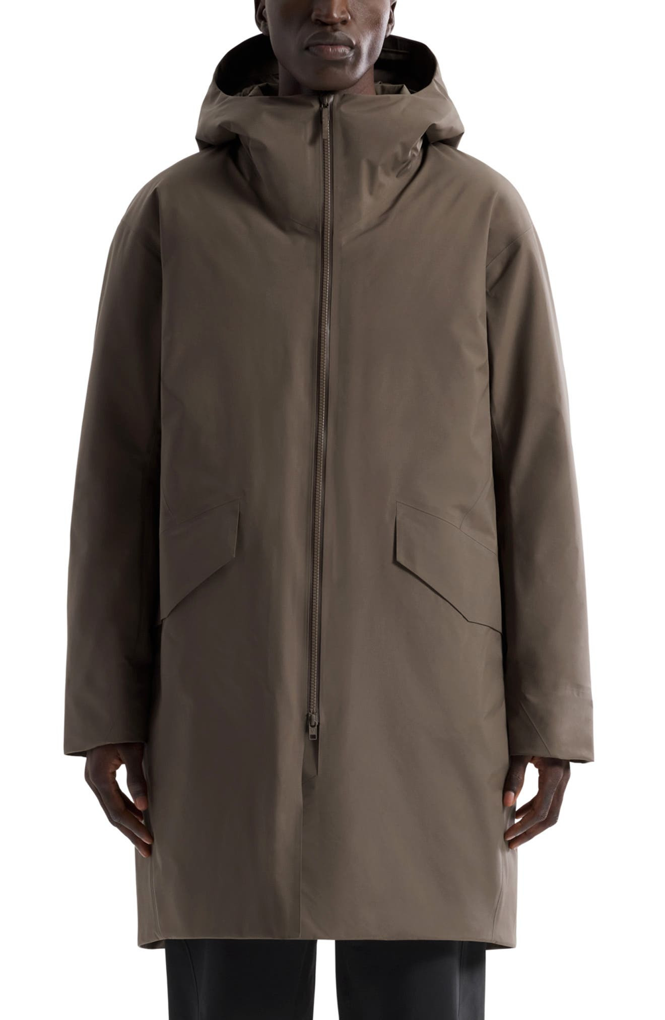 Enjoy full waterproof, windproof coverage and allover warmth in this hooded coat that's ready for literally any weather with strategically placed synthetic insulation where moisture may build up, while 850-fill-power-down ensures maximum warmth everywhere else. Two-way front-zip closure Stand collar; back-adjustable hood Front flap pockets; interior pocket Back vent Waterproof; windproof 80-denier three-layer plain weave with polyurethane membrane Gore-Tex® ePE provides all-condition waterproof, windproof, breathable protection 20-denier 42 g/m² downproof, waterproof recycled nylon lining, with 850-fill-power down and 80 g/m² Coreloft™ synthetic fill 100% nylon Machine wash, tumble dry Imported PFC/PFAS-free, durable water-repellent coating is free of per- and poly-fluorinated chemicals, some of which can be harmful to the environment