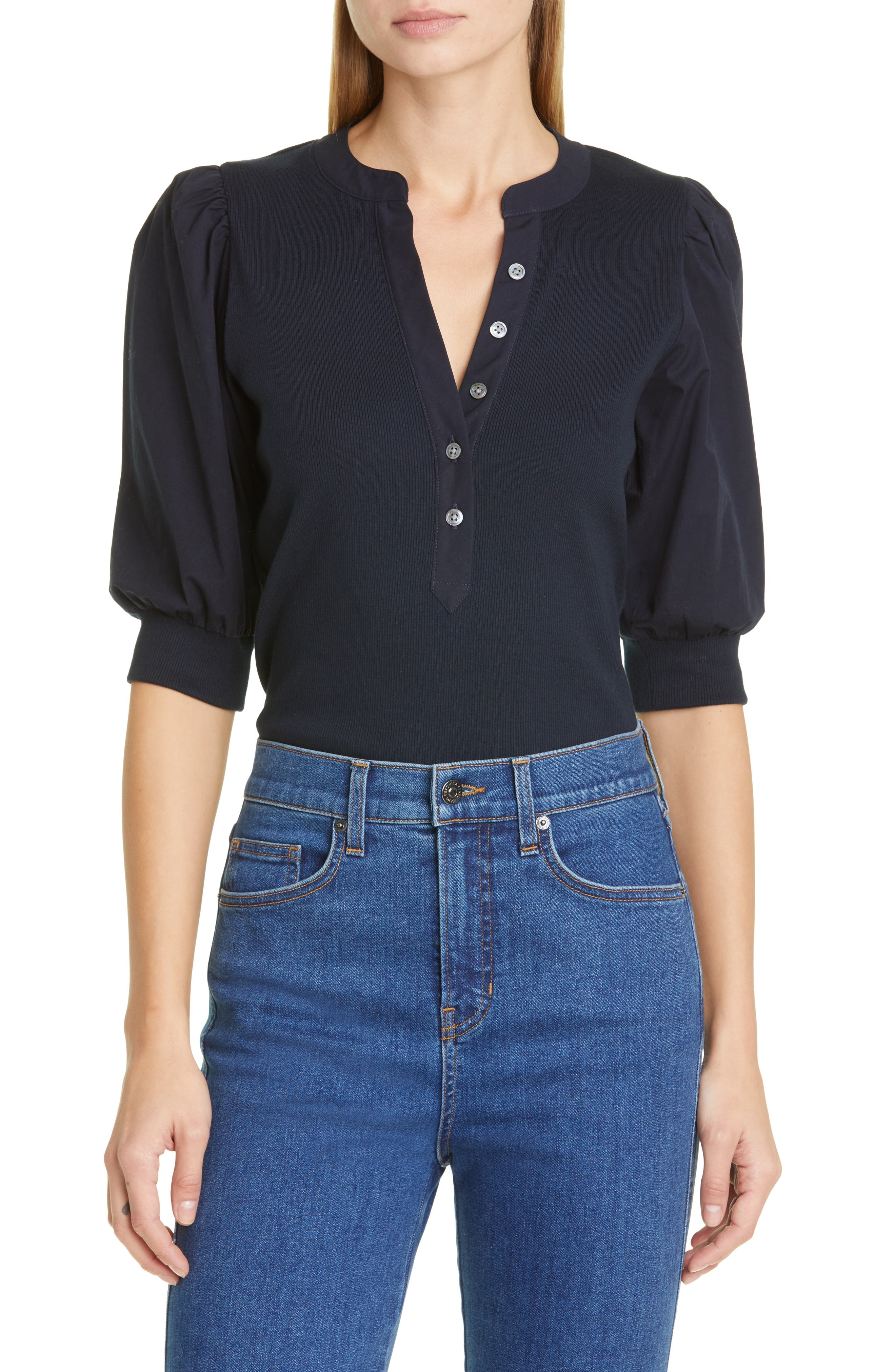 Woven puff sleeves frame this softly ribbed top that's full of textural interest and endless charm. 23 1/2" length (size Medium) Button half-placket Band collar Elbow-length sleeves 97% cotton, 3% elastane Machine wash, tumble dry Made in Peru