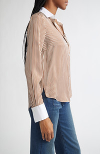 A crisp collar and cuffs complement the clean stripes on this silk-blend, button-up shirt that brings a fresh update to your workwear style. 26" length (size 8) Front button closure Spread collar Long sleeves with one-button cuffs Curved hem 54% silk, 40% viscose, 6% elastane Dry clean Imported