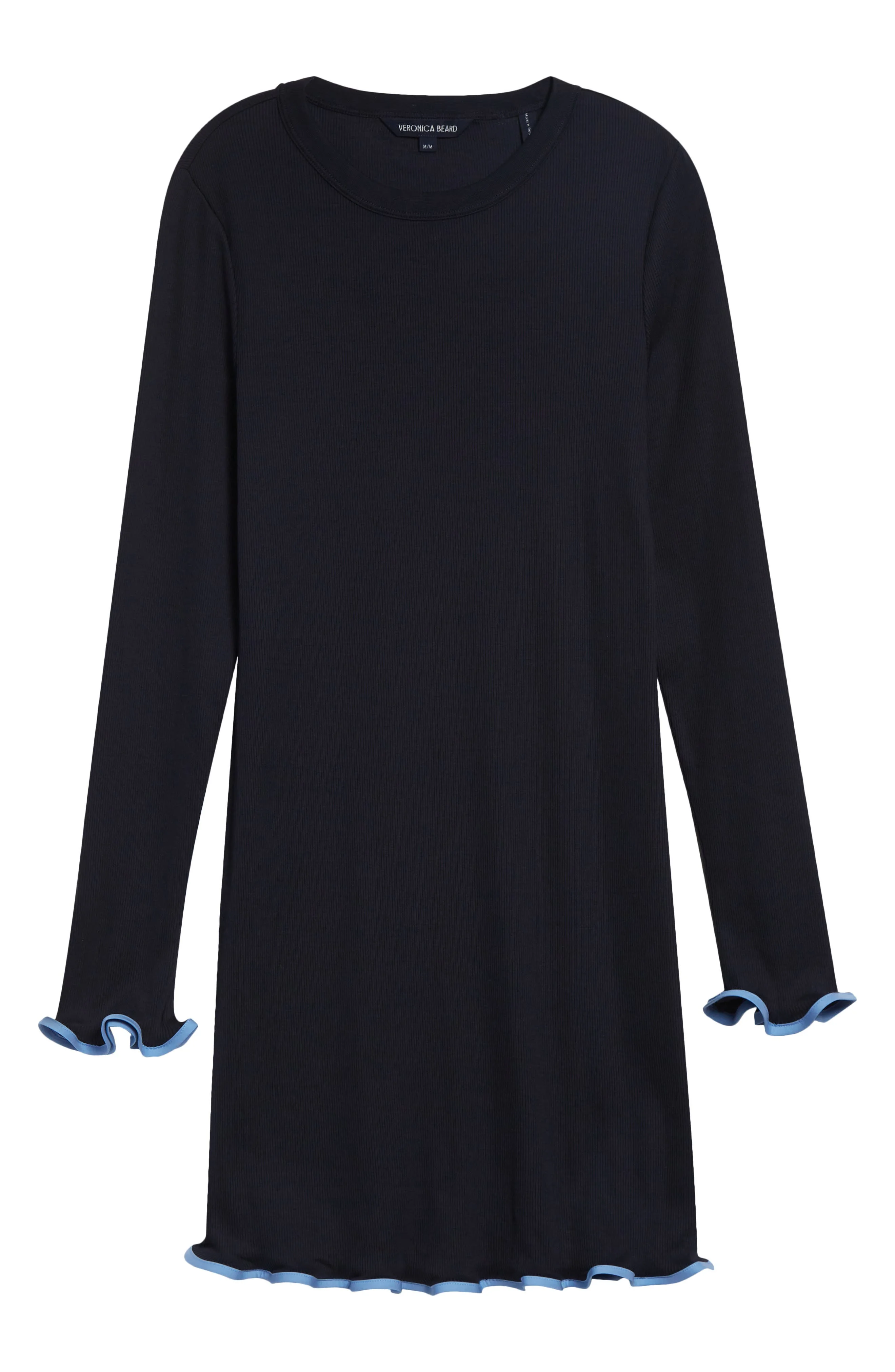 This ribbed stretch-cotton minidress hugs the body with a slim, easy fit and finishes with flirty lettuce-edge ruffles at the cuffs and hem. A clean crew neckline, long sleeves and contrasting piping sharpen the look, giving this everyday staple a dash of attitude. Slips on over head Crewneck Long sleeves 96% cotton, 4% elastane Dry clean Imported