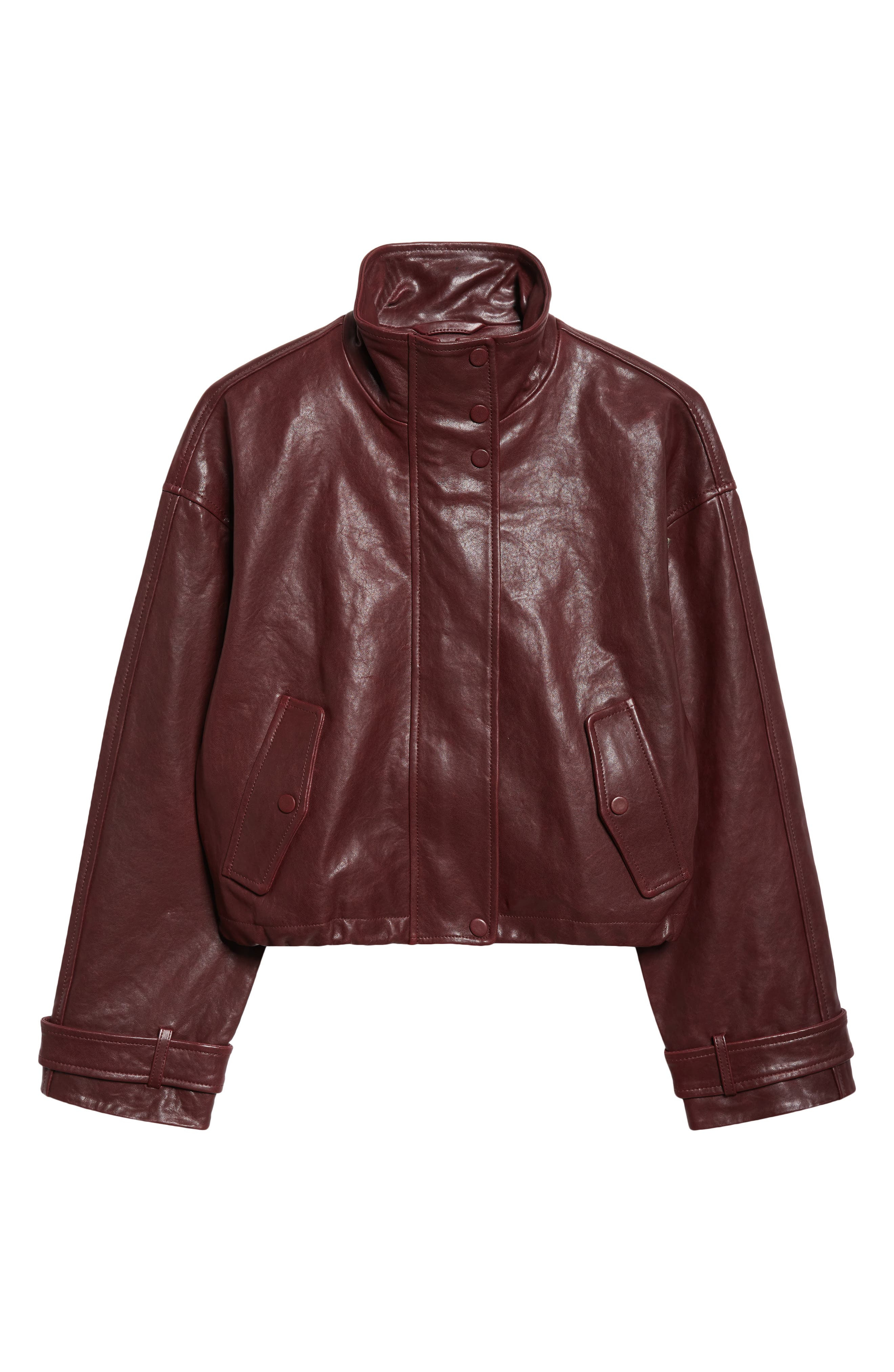 A glossy finish and a stand-up collar add fresh style to an endlessly wearable leather jacket. Front zip closure with snap placket Stand collar Banded cuffs Front snap-flap pockets Leather Professional leather clean Imported